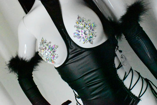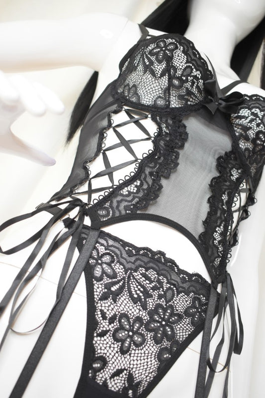 Athena Faux Leather Bodysuit with Side Lace-Up Detail.”