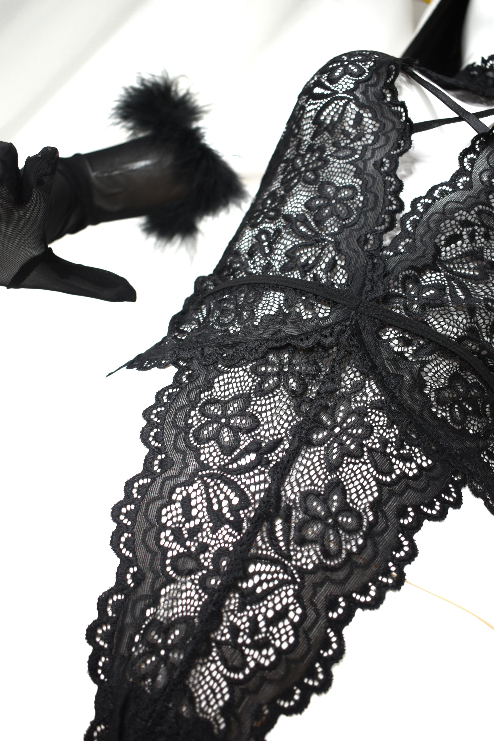 Este diseño combina el arte del encaje con la audacia moderna, convirtiéndose en un esencial para tu colección de lencería. Guantes no incluidos.